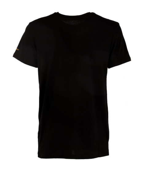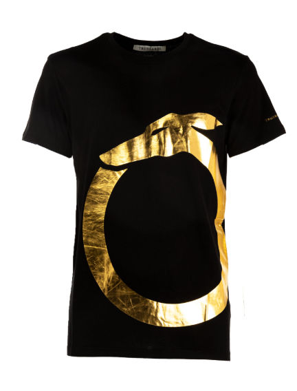 Trussardi Marškinėliai – stilingi juodos spalvos marškinėliai, dekoruoti elegantišku auksiniu raštu. Klasikinė spalvų derinio elegancija lengvai priderinama prie įvairių aprangų – tiek kasdienai, tiek ypatingoms progoms.
